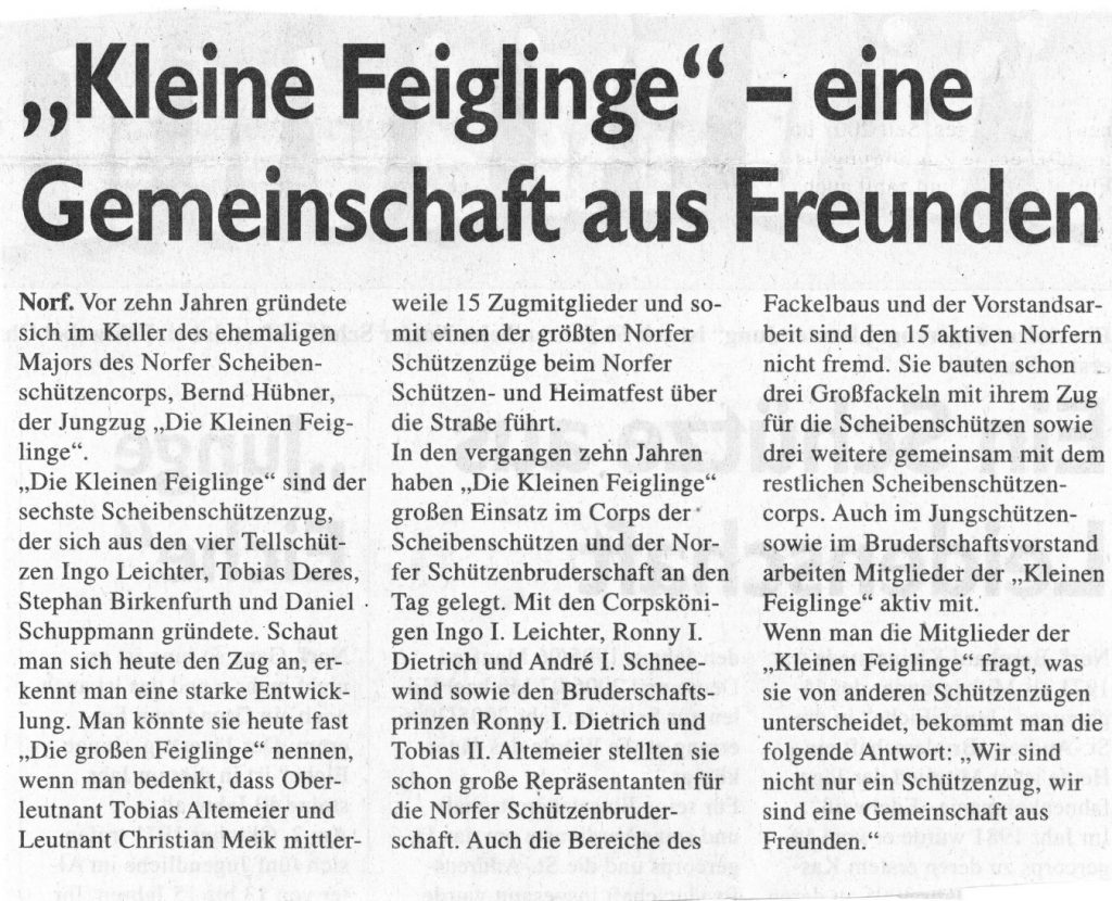 Zu Beginn Ihrer Schützenkarriere bestand der Zug "Die kleinen Feiglinge" aus 4 Gründungsmitgliedern und ist mittlerweile auf 14 Mitglieder gewachsen. Zum Höchststand 2013 liefen 17 "Kleine Feiglinge" in den Reihen des Norfer Scheibenschützencorps.